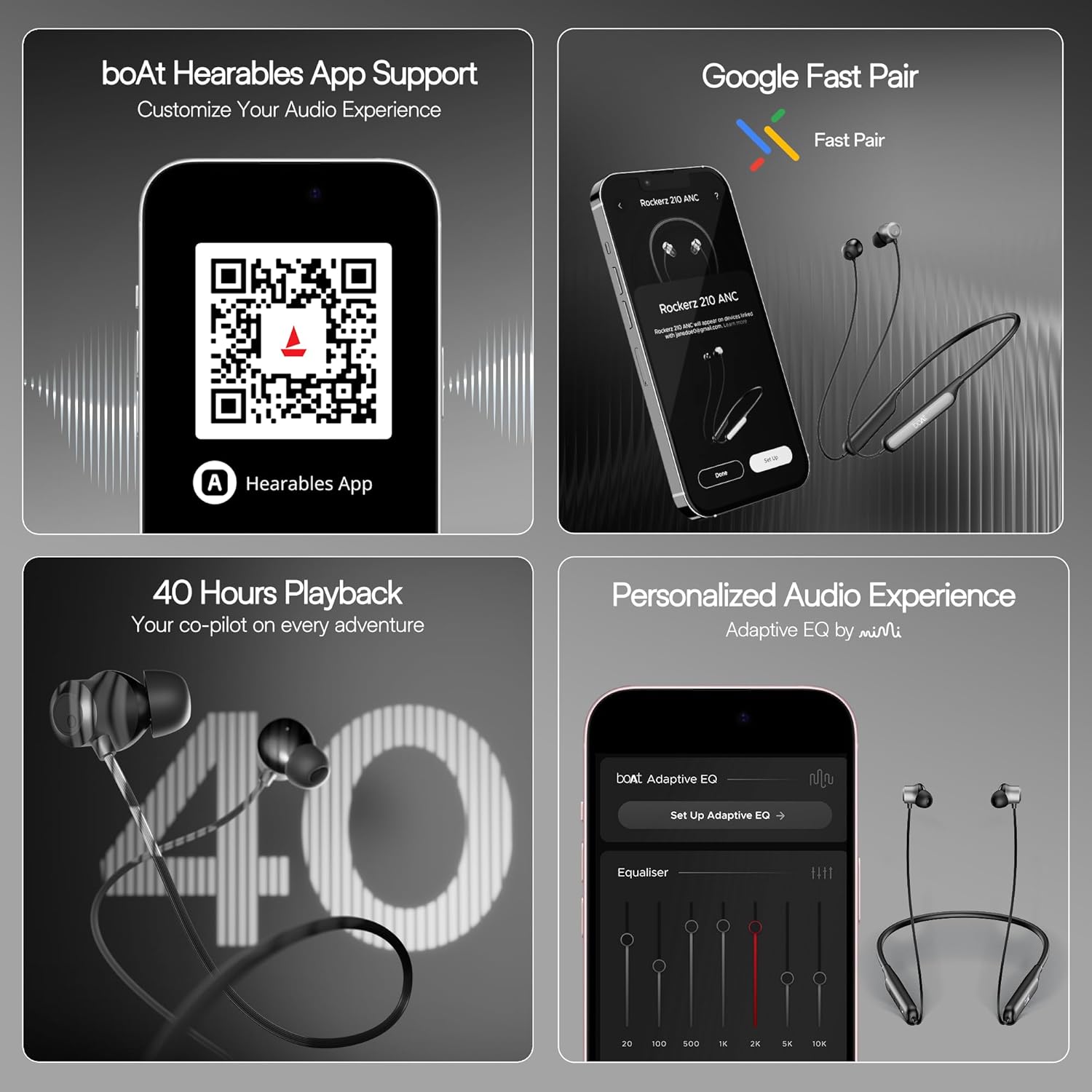 boAt Hearables App Support: Rockerz 210 ANC is equipped with boAt Hearables app support for easy one-tap control to turn on or off features, preset EQ modes, battery and connectivity status checking, Adaptive EQ by Mimi, etc. Find many controls within the app to upgrade your audio experience.